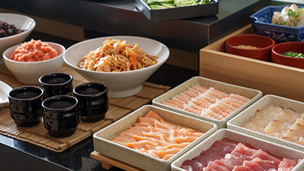 早餐以彰顯嚴選食材原汁原味的菜餚為核心,融入了天草產真鯛、福岡名產明太子等大量當地特色美味。